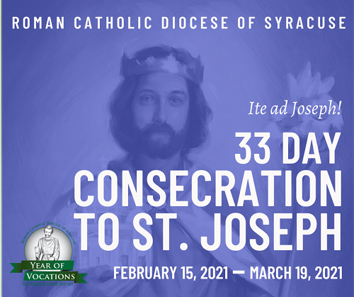 + Consecration of the Diocese of Syracuse to St. Joseph begins this Monday: On February 15, and continuing for 33 days, the consecration will culminate in a diocesan celebration of the Feast of St. Joseph at the Cathedral of the Immaculate Conception at noon on March 19. Honoring both the Year of St. Joseph and the Year of Vocations, we invoke the intercession of St. Joseph as patron of the Universal Church, and bring our diocesan family under his care and protection. The consecration is an opportunity to recommit ourselves to our baptismal calling, reminiscent of Joseph rising from a dream-filled sleep with renewed resolution to take Mary as his wife.