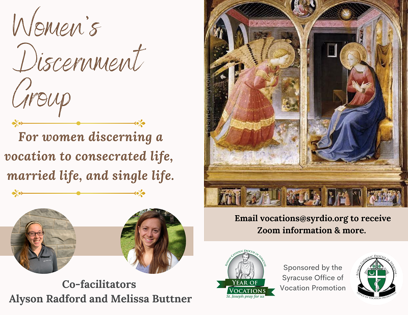 + New women’s discernment group…FIAT! – The Office of Vocation Promotion is pleased to announce the formation of a brand new online discernment group for women. This group is open to all women (18-40ish) in our diocese discerning a vocation to consecrated life, married life, and single life. This outreach is sponsored by the Syracuse Office of Vocation Promotion. The co-facilitators of this new group are Alyson Radford and Melissa Buttner. Email vocations@syrdio.org for more information as well as the Zoom info. The first meeting will be this Sunday, March 7th at 7 p.m.