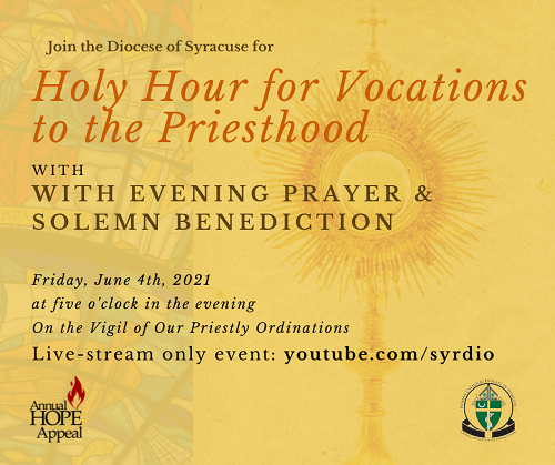 + On Saturday, June 5, Bishop Douglas J. Lucia will ordain four men to the priesthood. Tomorrow at 5 p.m., you are invited to watch a Holy Hour for Vocations on the Vigil of the Priestly Ordinations. Tune in to the YouTube channel of the Syracuse Diocese.