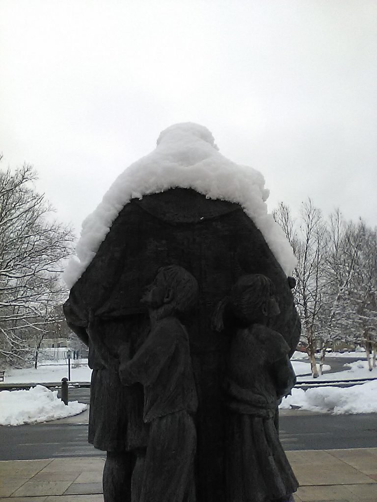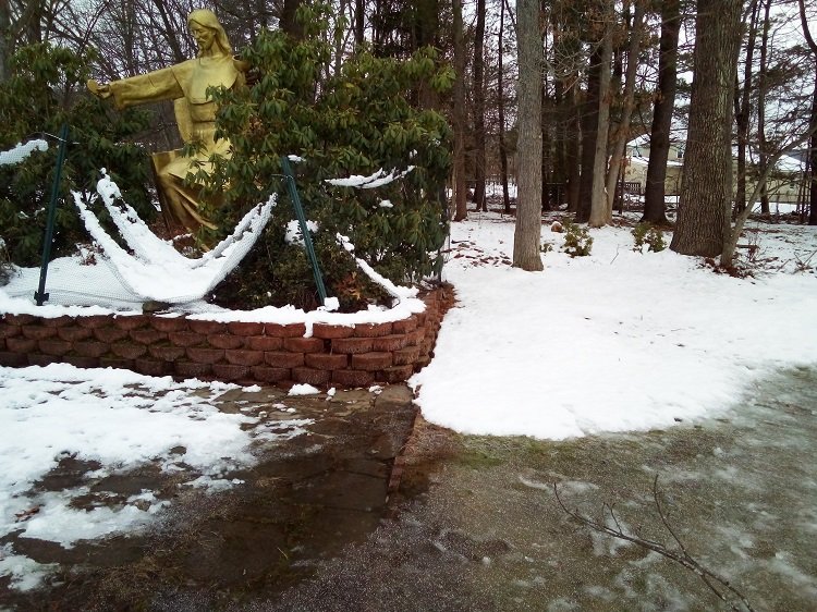 Look at the photo of the Jesus figure here in a “boat” of shrubs, with lots of water in front of Him. Reminded me of the Gospel passage and our recent weather. Like the apostles, I was “astounded” when I opened the door to all that snow. I was “fearful” driving back from Chenango County on Christmas morning with raging waterways out of their banks beside the road.