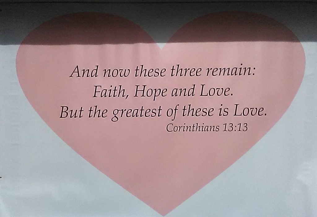Once inside the grounds, I saw a big heart on the bulletin board. Nice valentine for all to see. One line from 1 Corinthians 13. Just took time with that chapter the other day. Reminded me of many evenings my dad would read all of it aloud before we ate dinner.
