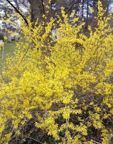 I looked out my back window this morning. A bit of yellow caught my eye. Thought at first I was looking at the hose. But then I turned my head and realized this color was much bigger. It was flowers, not daffodils. Smaller ones on branches where I’d not seen them for some time. A big forsythia bush was in bloom. What a beautiful sight! Certainly, it brings joy.