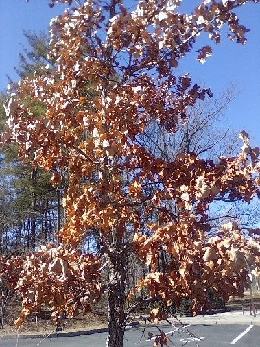 Sunny day today. Warmer temperatures. Not “officially” spring, yet it sure feels like it. Nice to walk around the grounds. Can’t wait to see the new growth. Um, wait a minute! Several months ago, as autumn was concluding I took a photo of this tree. It’s on the island between the roadway in front of the church. Months have gone by and the orange leaves hang on. C’mon, it’s time for greenery!
