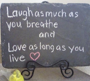 During a recent visit to Mercy House we’d given communion and prayed with a resident. To allow time for the others to visit, I decided to take a walk. Went toward the chapel, back to the waterfall wall. There’s an area for some refreshments near that. And a sign pictured above, handwritten in chalk.